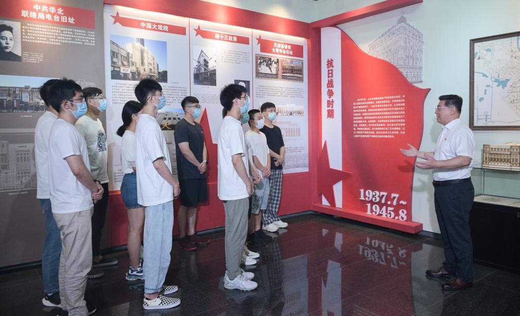 专题思政课前,白海力带领学生参观革命丰碑展并讲授发生在津沽大地的红色故事。