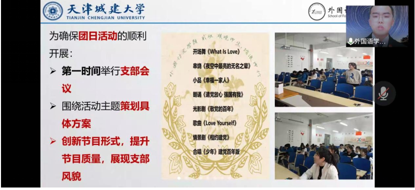 答辩会以线上形式举办,各学院团委围绕活动主题精心准备答辩材料,重点介绍了各学院开展的丰富多彩的团日活动以及过去一年各学院团委工作情况等。