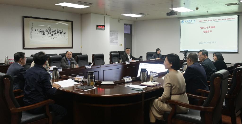 与会同志深入学习了习近平总书记在中国共产党第二十次全国代表大会上所作的报告、中国共产党第二十次全国代表大会关于《中国共产党章程(修正案)》的决议、天津市领导干部大会会议精神。与会同志进行了交流发言,纷纷表示党的二十大明确了新时代新征程党的使命任务,为奋进新征程、建功新时代提供了坚强政治保证和强大思想指引。要自觉把传达好、学习好、贯彻好党的二十大精神作为首要政治任务,全面贯彻党的教育方针,落实立德树人根本任务。要以服务国家和天津城市建设为目标,以学科建设为龙头,以教育质量提升为核心,以改革创新为驱动,深入实施关键技术科技攻坚、人才兴校战略,创新人才培养模式,以优异的办学实绩和育人成效,为全面建设社会主义现代化国家、全面推进中华民族伟大复兴贡献更多“天城大力量”。