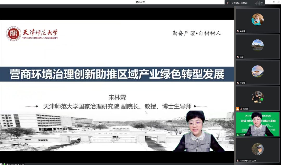 天津师范大学国家治理研究院副院长宋林霖教授以《营商环境治理创新助推区域产业绿色转型发展》为主题,从绿色发展、能源革命和营商环境入手,阐述了产业绿色转型是实现经济高质量发展的重要依托;并提出在营商环境改革赋能区域产业绿色转型中,坚持“双碳”目标导向,要持续推进“放管服”改革,推动产业链与创新链交叉融合,加强产业数字化平台建设,发挥一流产业园区引领作用,打造绿色创新服务高地等对策。