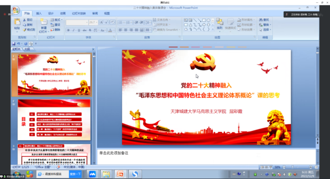12月9日,我校马克思主义学院毛泽东思想和中国特色社会主义理论体系概论(以下简称“概论”)教研室与天津工业大学马克思主义学院“概论”教研室联合举办“党的二十大精神进课堂”思政课集体备课会。会议由天津工业大学马院“概论”教研室主任张霞主持,我校马克思主义学院副院长桂锦峰,天津工业大学马克思主义学院副院长高德罡,两校“概论”教研室全体教师参加了本次会议。