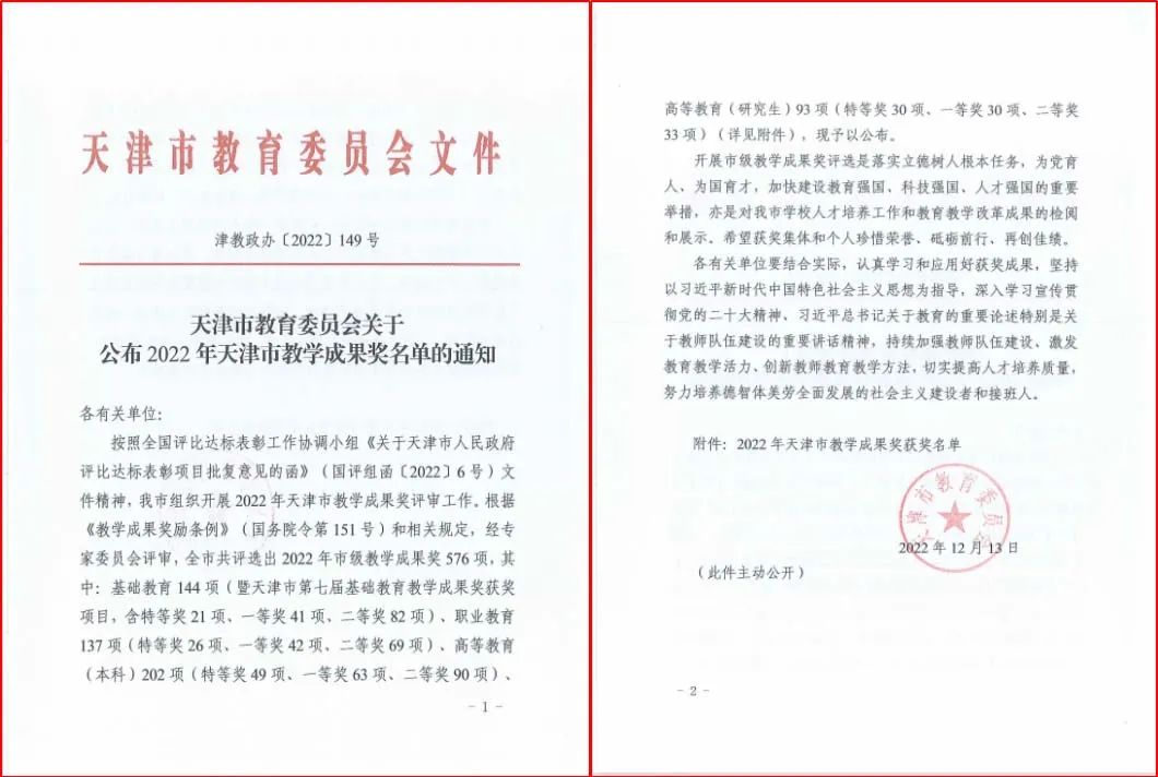 近日,天津市教育委员会公布2022年天津市教学成果奖名单,我校13项成果获奖。其中,我校作为第一单位获评的有11项,分别为高等教育(本科)一等奖5项、二等奖4项,高等教育(研究生)二等奖1项,基础教育二等奖1项;我校作为第二单位获评的有2项,分别为高等教育(本科)一等奖1项、二等奖1项。此次获奖是我校继2018年获评8项天津市教学成果奖以来在获奖种类、等级及数量上的又一次突破。