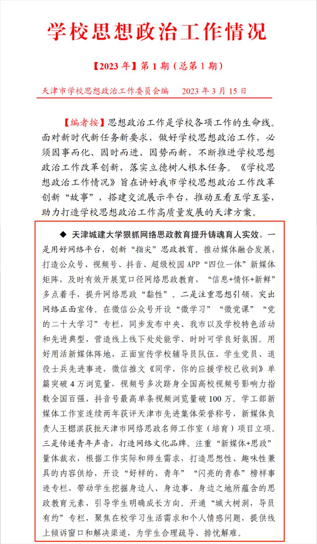 思想政治工作是学校各项工作的生命线。面对新时代新任务新要求,做好学校思想政治工作,必须因事而化、因时而进、因势而新,学校不断推进思想政治工作改革创新,落实立德树人根本任务。近日,我校狠抓网络思政教育提升铸魂育人实效的典型经验做法被天津市学校思想政治工作委员会汇编的《学校思想政治工作情况》【2023年】第1期(总第1期)收录。现将原文整理如下: