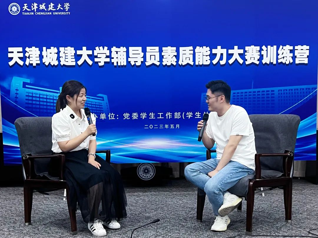 训练营通过现场实景模拟与典型经验分享相结合的方式进行。天津市优秀辅导员、土木工程学院团委书记付马学校首届辅导员素质能力大赛一等奖获得者、国际教育学院辅导员姜丽晶现场模拟大赛案例研讨环节,采用AB角形式,以“你提问,我回答”的方式,围绕案例共同辨析原因、研讨对策、总结规律。模拟展示结束后,付马和姜丽晶分别对案例研讨备赛的关键点进行了总结和阐释,表示在案例研讨中选手们既是竞争者、也是合作者,既要出招、也要接招,要争取通过高质量的提问回答,全方位展现自己的理论知识储备和解决实际问题的能力。