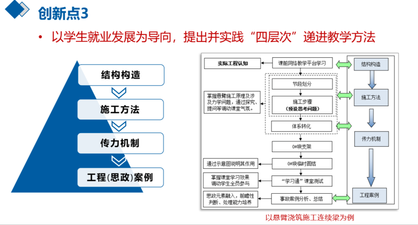 3.以学生就业发展为导向,提出并实践了“结构构造→施工方法→传力机制→工程(思政)案例”的“四层次递进”教学方法。