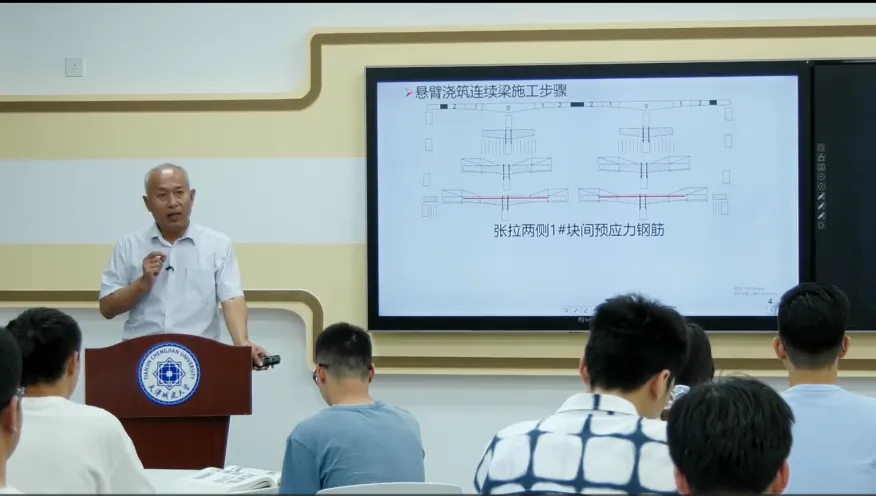 道路桥梁施工技术是我校道路桥梁与渡河工程专业和土木工程专业道桥方向的核心专业课,课程教学内容涵盖桩基、预应力施工、混凝土简支梁、连续梁,钢管混凝土、现浇混凝土拱桥施工等内容。课程团队多年来坚持开展教学研究,在教学内容、教学方法和教学手段方面,不断改革创新。在教学实践中,课程团队长期注重教学与科研互动,将科研成果融入到课堂教学中,并结合工程案例开展探讨,实施了“结构构造→施工方法→传力机制→工程案例”“四层次递进”教学法,在逐步培养学生遵守行业规范意识、灵活应用力学知识解决实际问题的同时,培养学生实际工程问题前瞻性判断、决策能力,提升其工程能力。