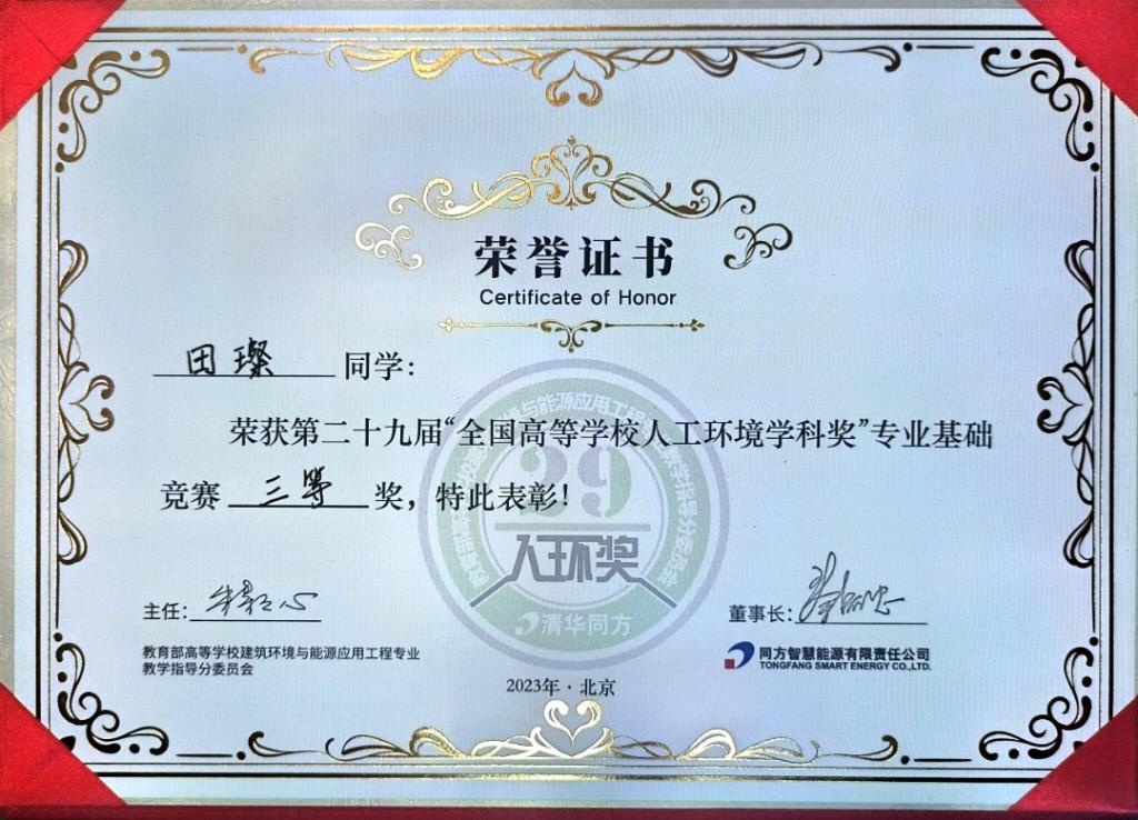 近日,我校能源与安全工程学院2020级建筑环境与能源应用工程专业1班田璨同学在第29届“全国高等学校人工环境学科奖”专业基础竞赛(简称:“人环奖”)中,经过激烈的角逐,荣获全国三等奖。