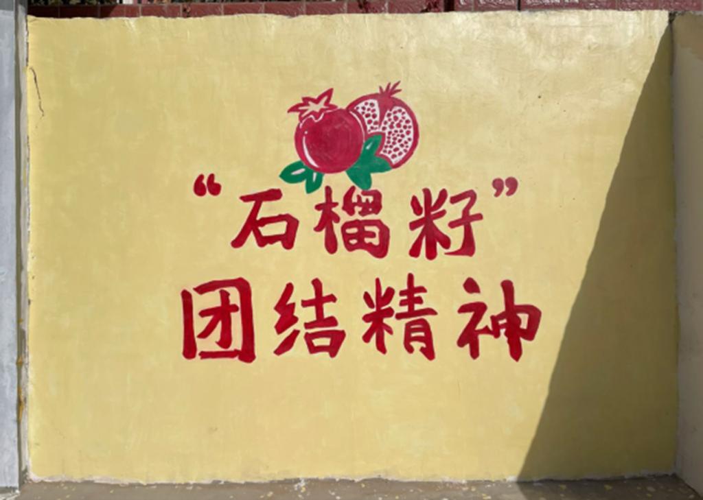 9月18日,经过前期多次实地考察,支教团小学组全体成员发现于田县第二小学的体育场舞台背景急需翻新绘制后主动承担绘制墙面工作。在和校方积极沟通、反复商定后,支教团多次开会研讨,墙面的主题确定为《中华民族一家亲,同心共筑中国梦》。