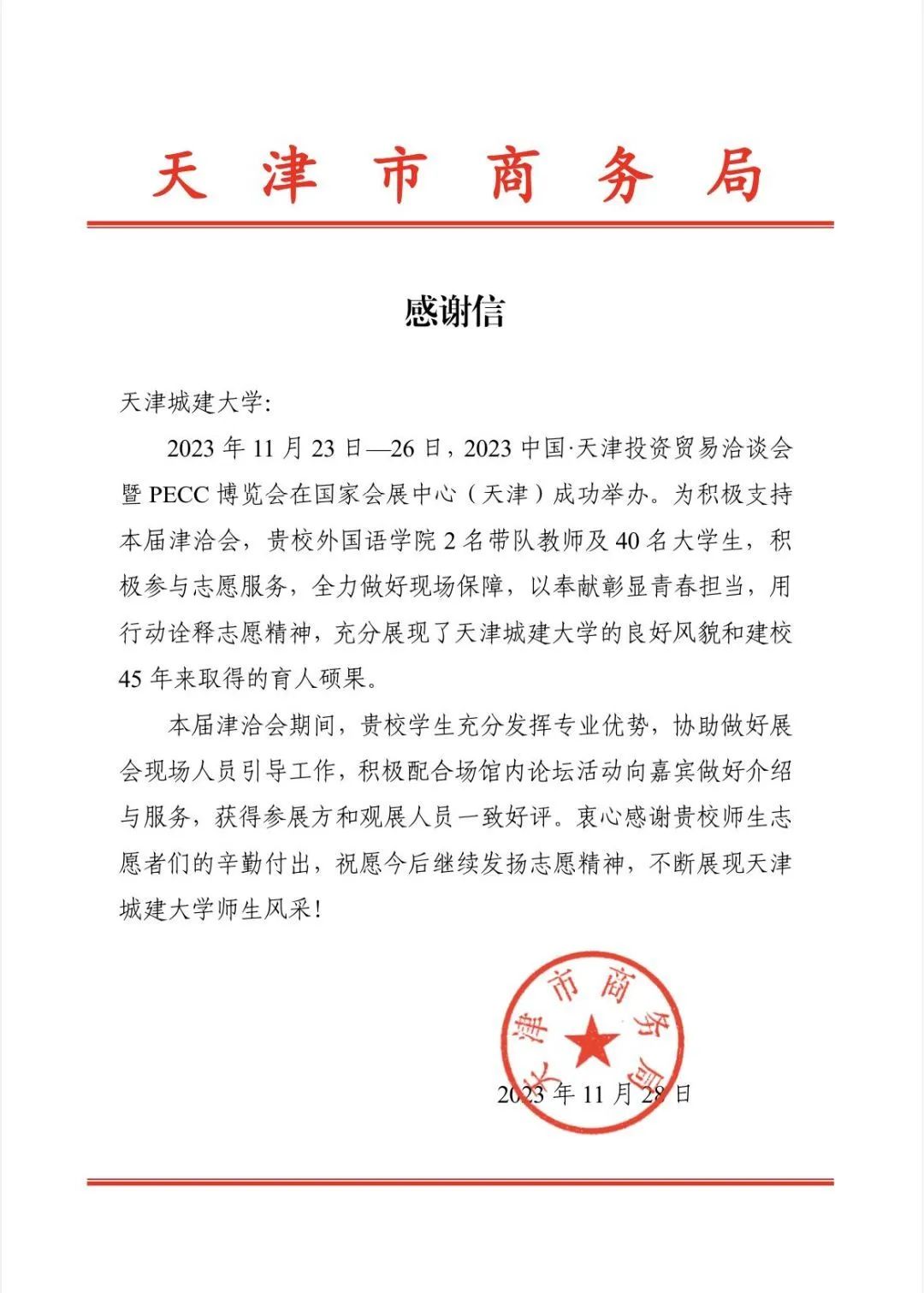 11月23日-26日,2023中国·天津投资贸易洽谈会暨PECC博览会(简称“津洽会”)在国家会展中心隆重举办。我校外国语学院带队教师王韦蒙、张锡以及40名大学生志愿者圆满完成了此次津洽会志愿服务工作。