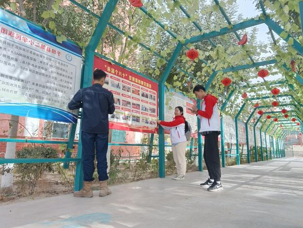 为进一步提升校园文化建设,支教团全体成员为于田县第二小学的文化长廊提供改造方案,致力于为孩子们创造一个更好的学习生活环境。支教团成员们经过深入调研和精心策划,提出了一整套全面的改造方案,力争将文化长廊打造成一个集教育、艺术、科技和生活于一体的综合性文化空间。