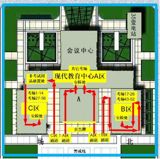 现代教育中心各考场通道入口均位于南侧大台阶前(如下图所示),1-14考场、27-36考场在C区通道排队入场,17-26考场、43-52考场在B区通道排队入场,其余考场在A区通道排队入场。