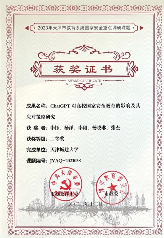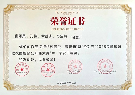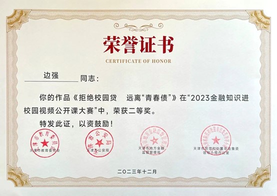近日,市教育两委公布了2023年天津市教育系统国家安全重点课题调研获奖结果和天津市2023年金融知识进校园视频公开课大赛获奖结果。我校1项课题,5幅作品纷纷获奖,学校被评为2023年金融知识进校园视频公开课大赛优秀组织单位。