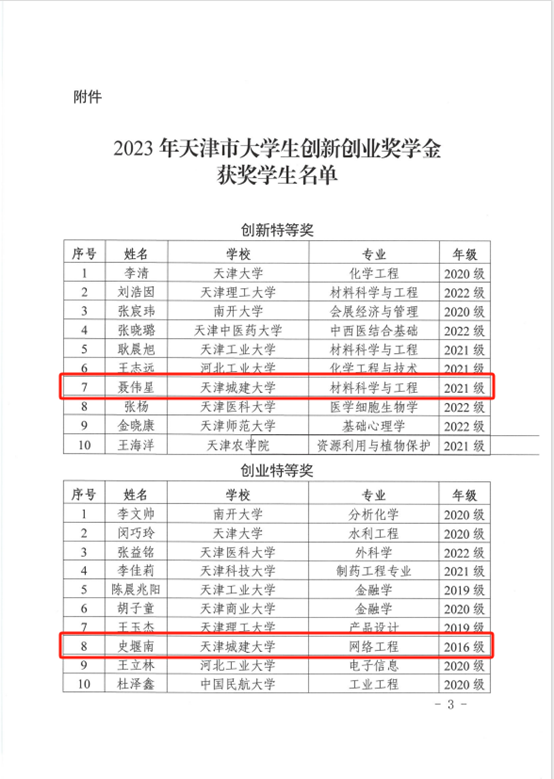 材料科学与工程学院2021级硕士研究生聂伟星被授予天津市大学生创新特等奖学金(天津市仅10名);计算机与信息工程学院2016级本科生史堰南被授予天津市大学生创业特等奖学金(天津市仅10名)。经济与管理学院2022级硕士研究生邱佳美,国际工程学院2021级本科生王博远荣获“创新优秀奖”。土木工程学院2020级本科生郭芃垣,环境与市政工程学院2021级硕士研究生张旭荣获“创业优秀奖”。