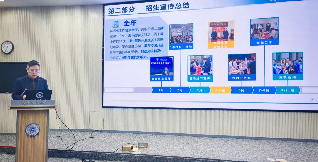 会上,教务处(招生办公室)副主任陈烜从录取数据分析、招生宣传总结和来年工作重点三个方面进行了2023年度招生工作总结汇报。通过对录取数据的多角度分析、介绍了我校在全国33个省、市、自治区的录取位次变化情况和我校在津招生的录取情况;以服务考生及家长为初心、以提高我校生源质量为目标,学校精心设计了全年的招生宣传工作内容,突出多角色参与、多形式交叉,以“全年、全员、全渠道”的招生宣传模式为抓手,顺利完成了招生宣传的每一项工作;根据本年度招生宣传工作的经验及学生群体的调研反馈,对来年招生宣传工作进行了重点谋划。
