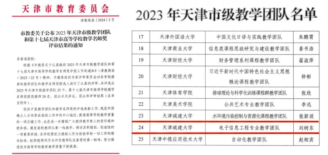 近日,市教委公布天津市级教学团队评审结果,我校环境与市政工程学院张新波教授带领的“水环境污染控制与资源化课程教学团队”和计算机与信息工程学院刘树东教授带领的“电子信息工程专业教学团队”获评2023年市级教学团队。至此,我校获评市级教学团队18支。
