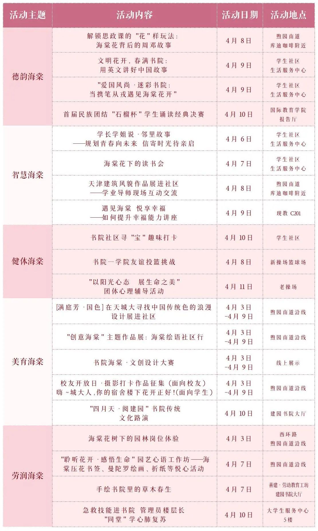 学校围绕学生社区做足文化功课,练好育人基本功。为丰富学生社区“文化+”内涵,充分挖掘品牌强校“硬”资源,以书院制“一站式”学生社区建设,推动“时代新人铸魂工程”落地生根,培养造就德智体美劳全面发展的社会主义建设者和接班人,精心打造“德韵海棠”“智慧海棠”“健体海棠”“美育海棠”“劳润海棠”文化创意系列活动,让“师生情”“校友情”溢满学生社区。春日相约建园,“寓”见美好花开,诚邀师生、校友共享城大美景,共谱书院新篇!