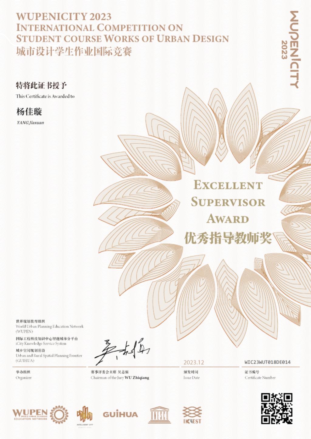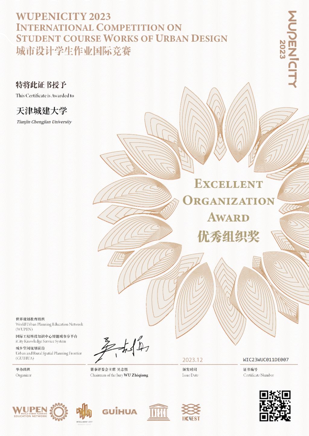 贺信指出,本届国际竞赛组委会共收到符合参赛要求的投稿作品1624份(其中,城市设计学生作业国际竞赛913份,城市可持续调研报告国际竞赛711份),经过两轮专家评审,最终确定获奖名单。我校学生获一、二和三等奖共计6份;威客电竞荣获优秀组织奖,曾穗平、杨佳璇老师荣获优秀指导教师奖。