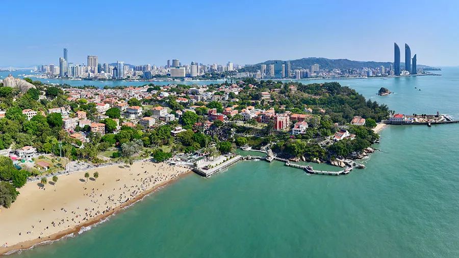 游人在厦门鼓浪屿沙滩上游玩(无人机照片)。新华社记者姜克红摄