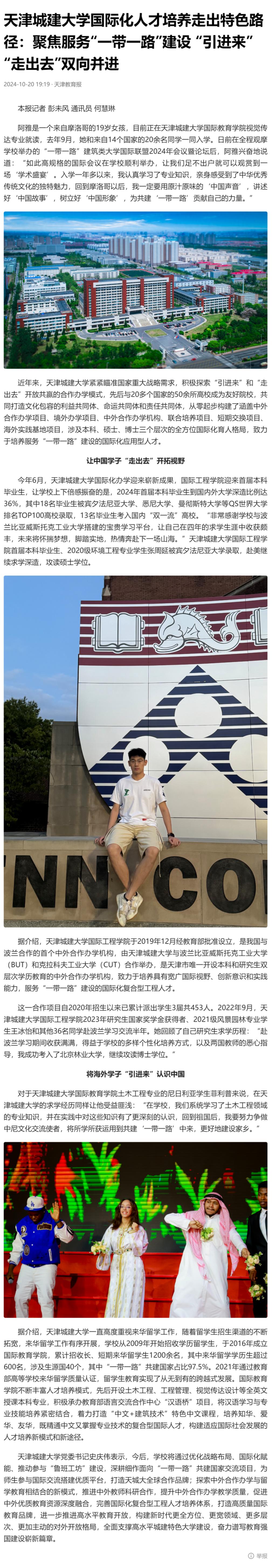 10月18日-20日,“一带一路”建筑类大学国际联盟2024年会议暨论坛在我校隆重召开。来自12个国家的20余位大学校长和企业家、40余所高校与机构的百余名联盟成员代表,围绕“共‘筑’盛世之路 同绘繁华之卷”主题,共商“一带一路”联盟发展蓝图,共建“一带一路”建筑教育共同体,共同为拓展高水平特色发展平台,构建全方位国际化人才培养体系,打造高质量发展新高地建言献策。会议受到了人民日报、新华社、光明日报、中国日报、中国新闻网、中国青年报、中国教育新闻网、天津日报、津云、天津教育报等多家媒体宣传报道。