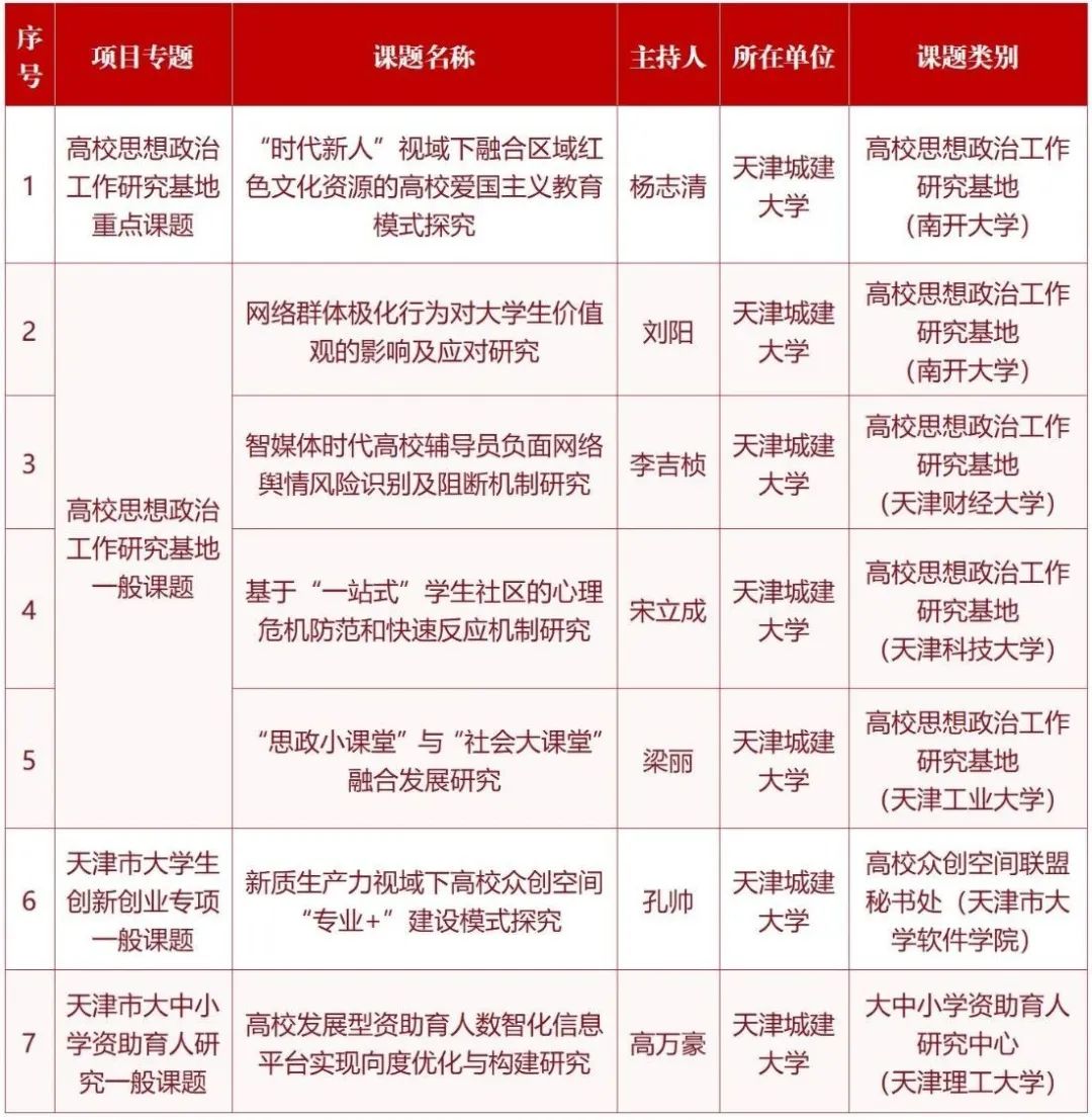 近日,市教育两委公布了2023年天津市大中小思想政治工作专项课题结项和2024年大中小思想政治工作专项课题立项名单。经专家组评审,我校5个课题顺利获批结项;在2024年度大中小思想政治工作专项课题中,7个课题获批立项,其中重点课题1项,一般课题6项。