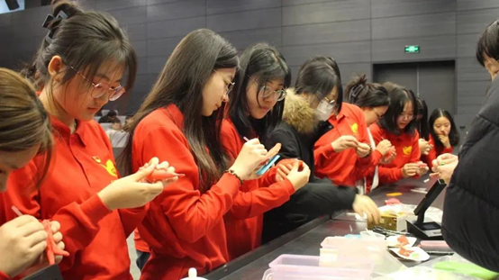 随后,同学们踊跃上台,近距离欣赏传统艺术的美,感受其中的文化底蕴和时代精神。王玓示范并讲授了面塑作品《鱼戏荷塘》的制作方法,在王老师的指导下,同学们亲身体验面塑的制作,完成了一个个栩栩如生的作品。王玓对大家亲手实践的作品给予充分肯定并鼓励学生积极做中华优秀传统文化的学习者、宣传者和践行者,让非遗“活下来”“火起来”,创造属于青年一代的文化成就。