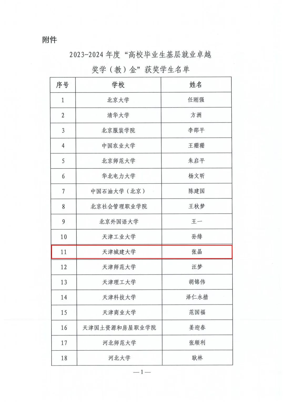 近日,教育部高校学生司转发了“全国高校毕业生基层就业卓越奖”奖励委员会《关于公布2023-2024年度“全国高校毕业生基层就业卓越奖学(教)金”获奖人选的通知》,全国共有398名毕业生获奖,天津市共有7名。我校2017届硕士毕业生张晶获此殊荣,这也是我校连续两届荣获“全国高校毕业生基层就业卓越奖”。