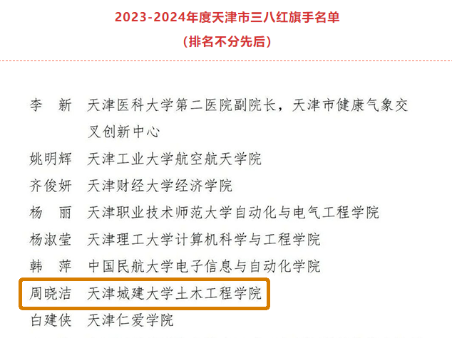 近日,天津市妇女联合会公布2023-2024年度天津市三八红旗手标兵、三八红旗手(集体)评选结果,我校土木工程学院周晓洁荣获天津市三八红旗手荣誉称号。本次评选,教育系统高校共有9人获此殊荣。