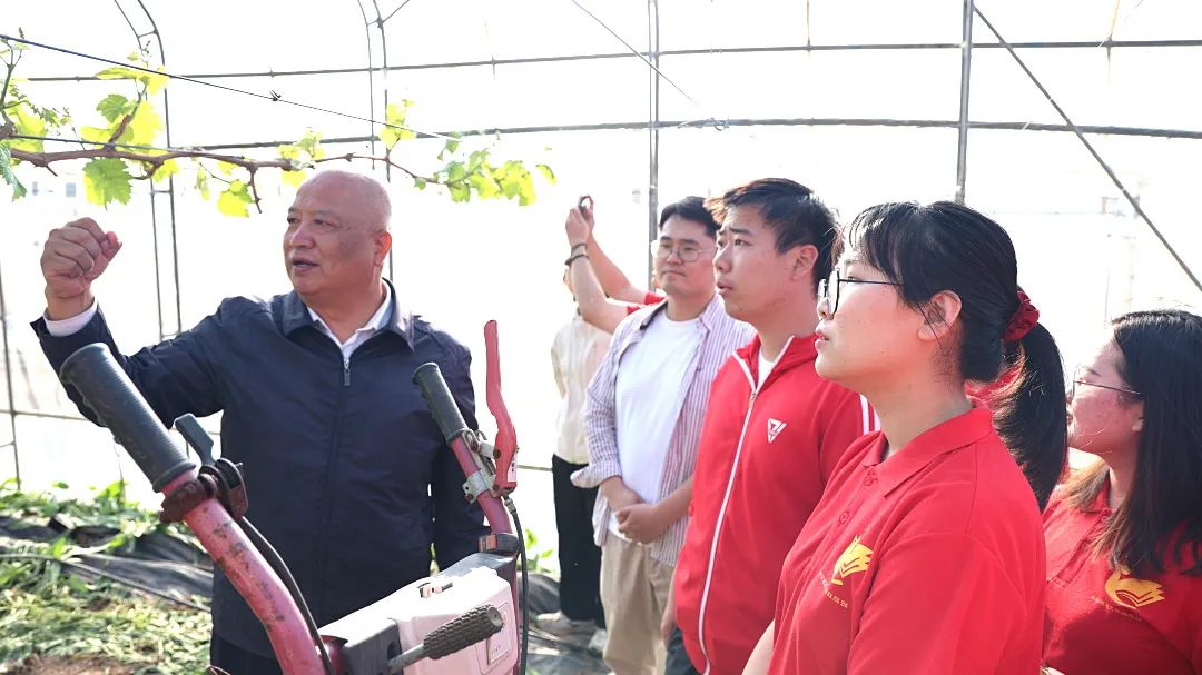 在山水兰韵生态庄园,杨长庚带领学生们进一步了解庄园的规划,深入垂珠堡葡萄种植园实地观察,了解葡萄生长与养护的知识,共同为柒仙女葡萄打响知名度出谋划策,同学们也积极建言献策,助其进一步提升特色农产品的市场影响力和竞争力。
