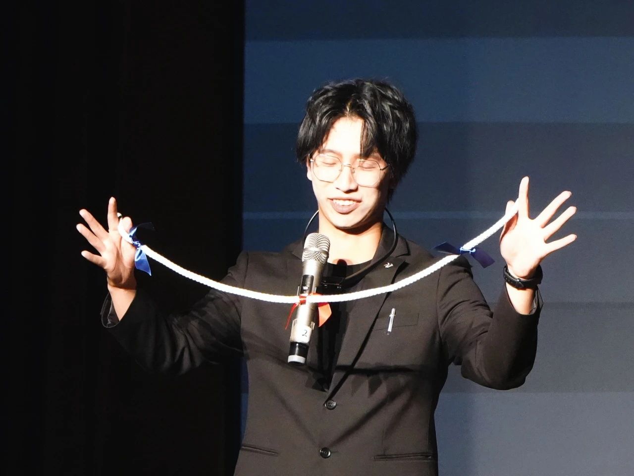 演出以主持人的指尖魔术拉开序幕,舞台化作光影交织的奇幻世界。大型魔术《大变活人》以惊险刺激的瞬间将观众带入魔术之旅,魔术师在密闭空间内瞬间换位在观众意想不到的位置突然出现,引得全场欢呼;《井字游戏》将经典棋盘博弈转化为悬念迭起的互动魔术,观众随机选择的棋子与数字却难逃魔术师“预判”,智慧与幻术的碰撞点燃现场热情;《圆环之理》中,银环在魔术师指间穿梭、悬浮、链接、分离,以极简道具和清新的配色演绎宇宙法则般的哲学美感;《伞耀奇迹》则以雨伞为主要表演元素,在魔术师的手中翻飞起舞,凭空在手中出现惊人数量的雨伞,令人瞠目结舌。