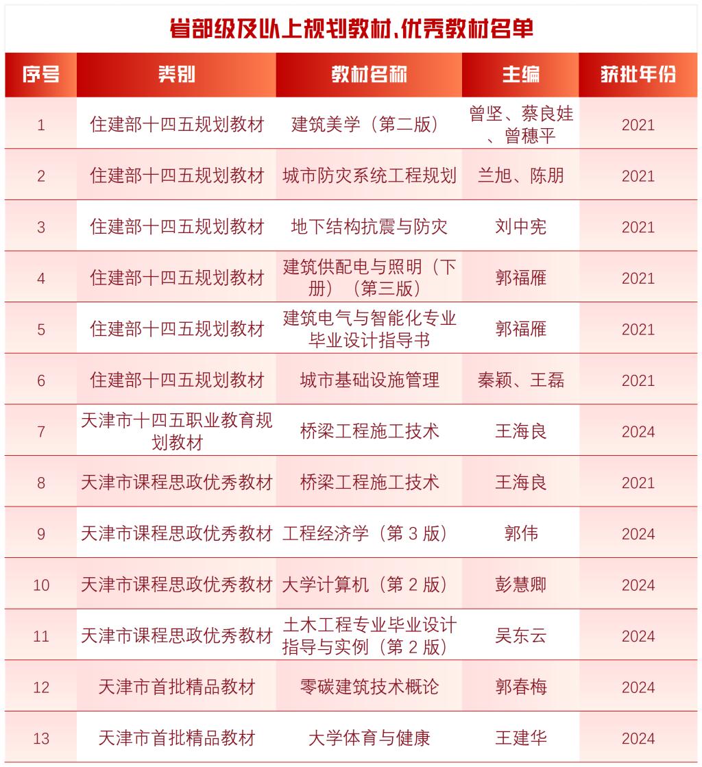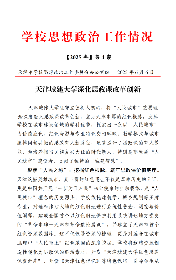 成立“1+17”立体化课程思政矩阵——设立校级教学研究中心,联动17个教学单位分中心,选树9个标杆示范中心,实现课程思政全覆盖。建筑工程系获评首批天津市级普通高校优秀基层教学组织。累计建成教育部及市级示范课程25门、市级优秀教材4种及故事思政微课大赛课程思政组特等奖1项,斩获教育部、市级高校思政工作精品项目24项,领跑全市高校。首创以红色建筑讲述地方党史新模式,依托革命丰碑展馆、红色文化遗产研究院,将百年建筑转化为沉浸式党史课堂,获批天津市红色文化遗产保护科普基地等5个基地。