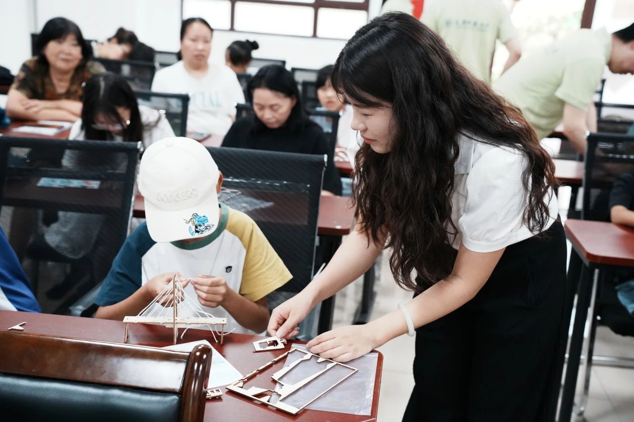 模型制作现场变身为生动的工程课堂。在实践团的指导下,18名孩子化身“小小桥梁建造师”,投入了“索塔-钢索-桥面”的协作搭建挑战中。第一步,筑基立塔。孩子们用木片精心拼搭出稳固的A型索塔,亲手构筑“根基”的过程,让他们深刻体会到“站稳脚跟,方能支撑全局”的道理。第二步,聚力拉索。孩子们将棉绳系于塔顶,协同用力,拉直绷紧每一根“钢索”—— “绳子绷直才有力量!”孩子们兴奋地交流着心得,感受着“聚力协作”的魅力。第三步,桥面吊装。当轻质桥面板平稳悬挂在拉索系统上时,现场响起一声声惊叹。“原来桥梁是这样承受重量的!”一位小朋友兴奋地说道。