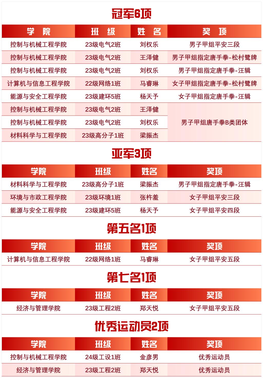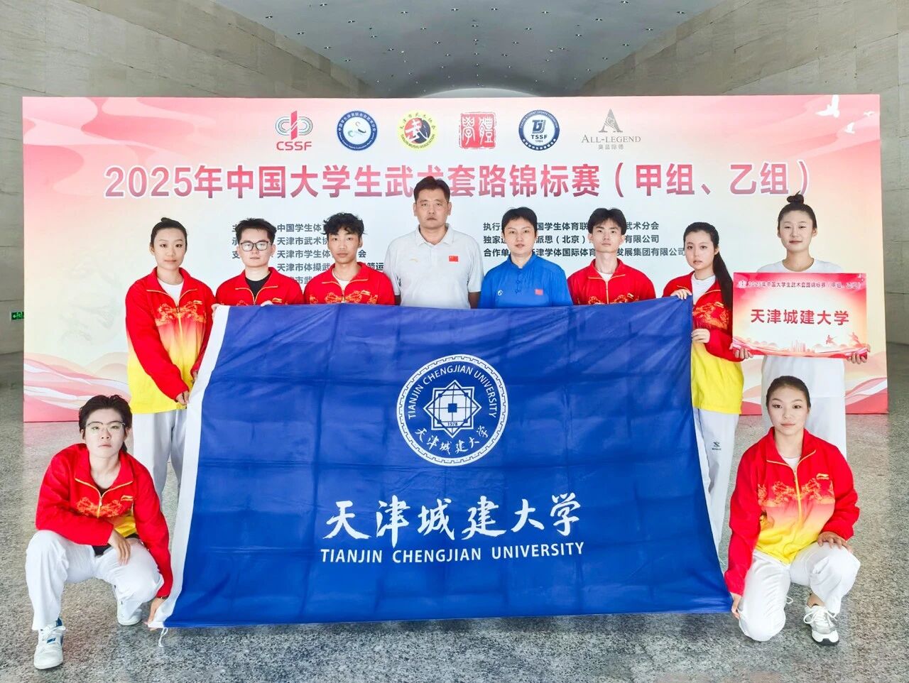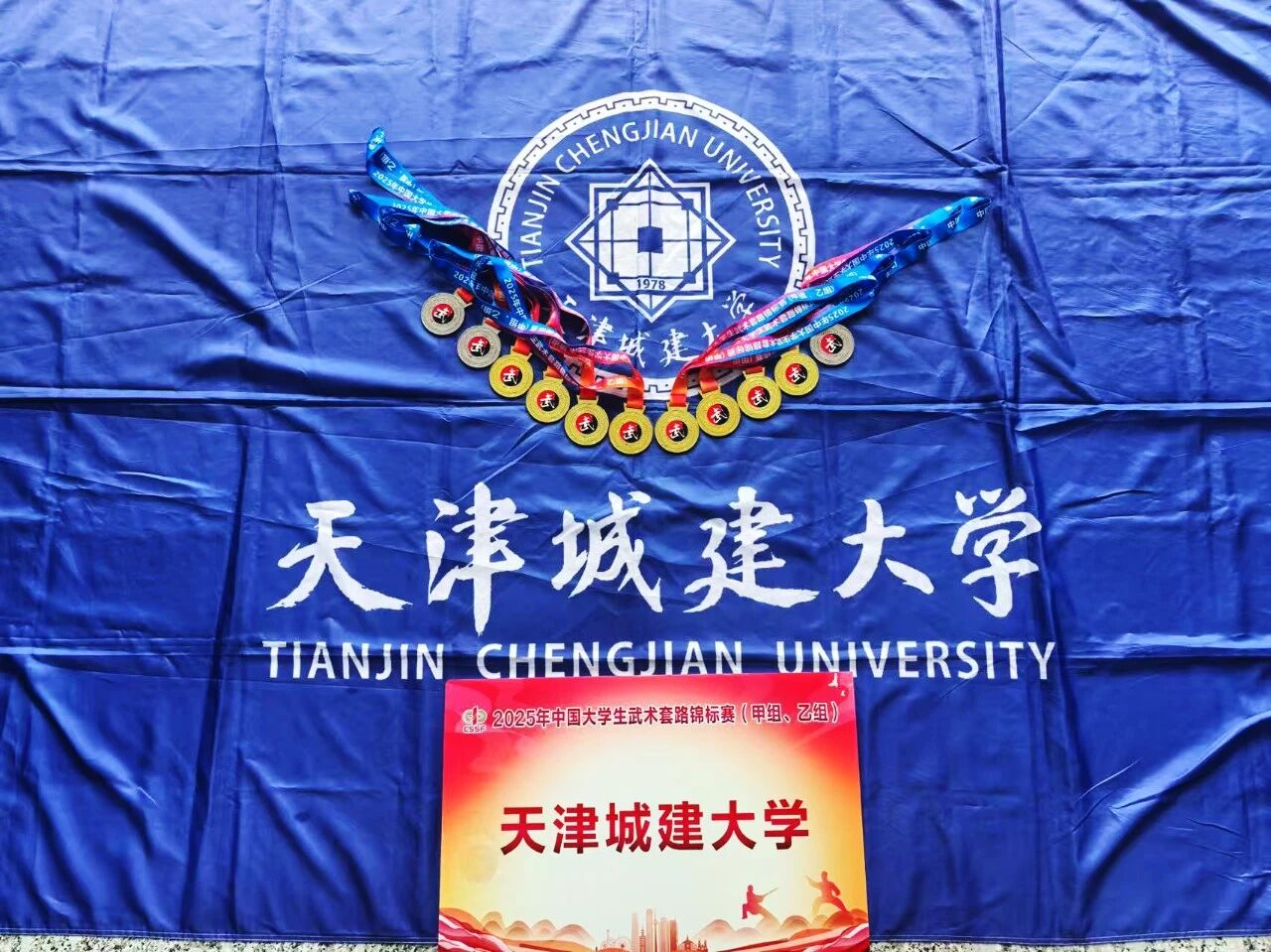 2025年7月27-31日,由中国学生体育联合会主办,中国学生体育联合会大学武术分会执行,天津市武术协会承办的2025年中国大学生武术套路锦标赛在天津市武清区盛大举行,来自全国各地241所高校的2000余名运动员、教练员齐聚一堂,共同参与这场武术盛会,参赛人数创历史新高。经过激烈角逐,我校武术健儿首获佳绩,勇夺6金3银。