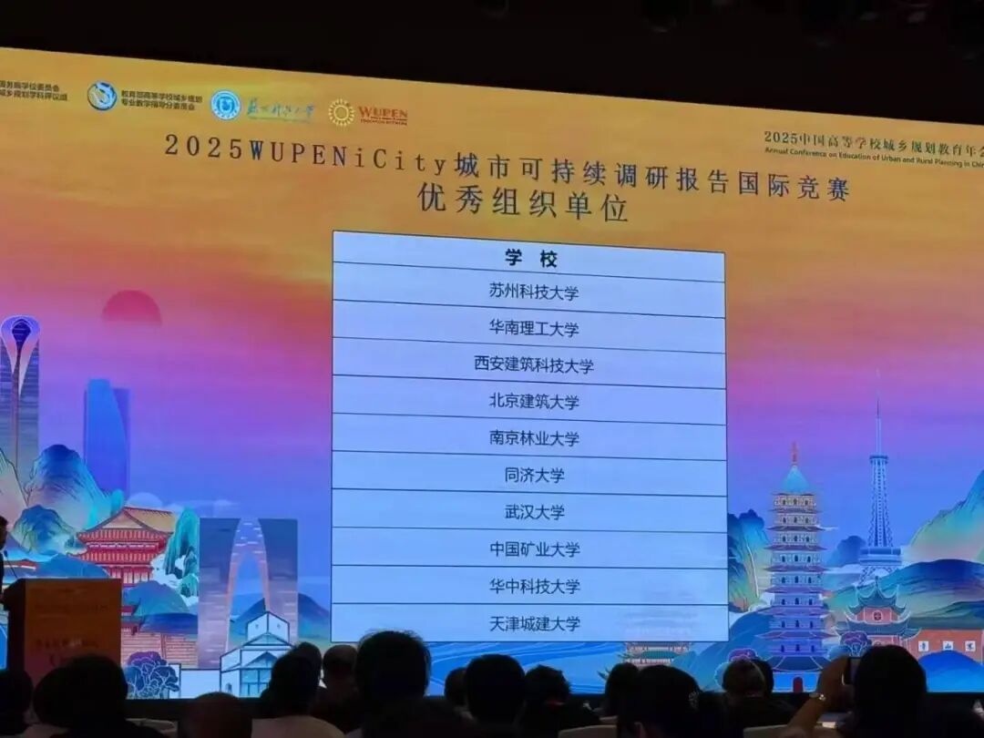 近日,2025年中国高等学校城乡规划教育年会在苏州科技大学召开。本次大会由国务院学位委员会城乡规划学科评议组、教育部高等学校城乡规划专业教学指导分委员会主办,苏州科技大学承办,世界规划教育组织WUPEN、中国建筑出版传媒有限公司、北京津发科技股份有限公司、苏州规划设计研究院股份有限公司协办。我校建筑学院多位教师受邀参会,斩获多项荣誉,并做分会场主旨报告。