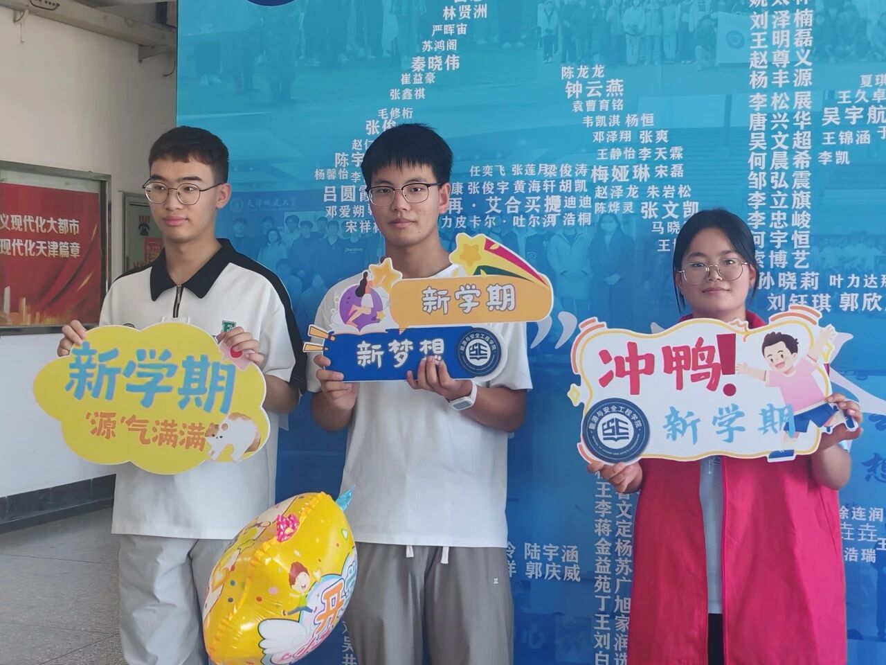 新生与家长们在背景墙前驻足