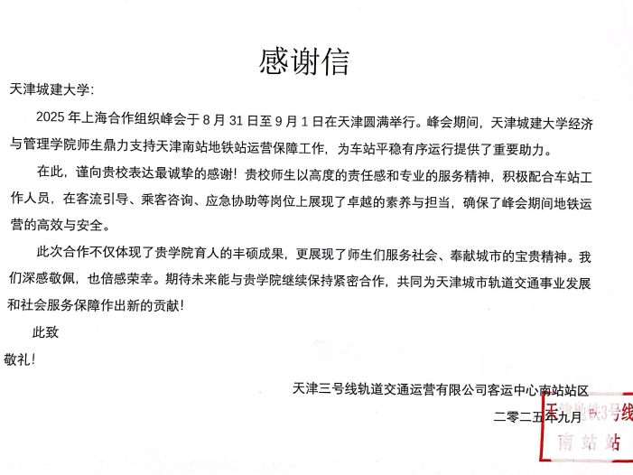 “第一次用英语帮外国乘客成功规划出行路线,虽然紧张但特别有成就感。”参与志愿的刘同学分享到。“从天津南站到各个景点有这么多换乘细节要注意,这次志愿活动不仅帮了别人,也让我更了解自己求学的这座城市。”参与志愿的王同学的感悟道出了许多志愿者的心声。志愿服务活动结束后,天津南站地铁站向我校发来感谢信,感谢我校在上合峰会期间为确保南站地铁站的平稳有序运营做出的贡献。