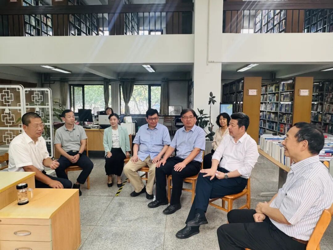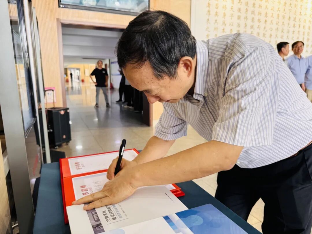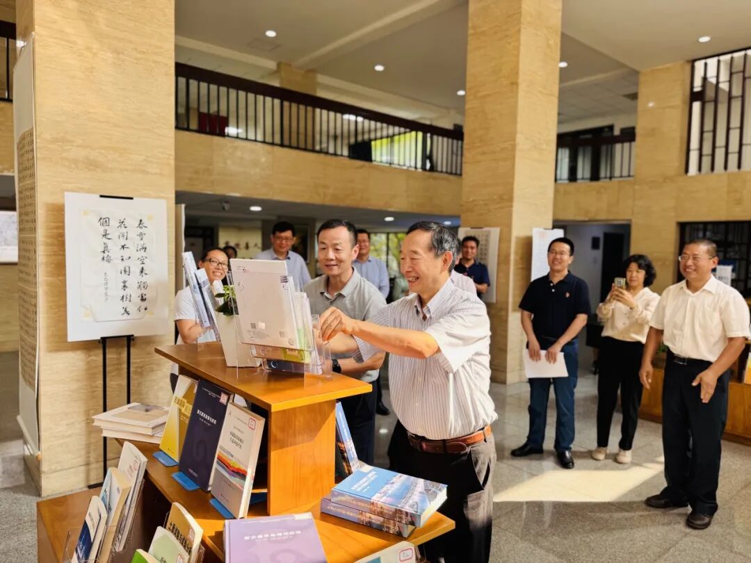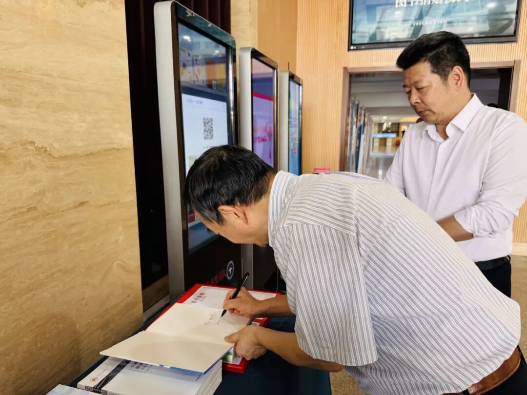 捐赠仪式现场,杨洪兴教授为图书亲笔签名,为图书馆签写捐赠寄语——“祝愿图书馆每天灯火通明,照亮学子前程”。杨教授还结合自身学术经历分享了对知识传播与学术交流的见解。图书馆馆长张文强代表学校接受捐赠。图书馆直属党支部书记刘志军与杨洪兴教授共同为捐赠图书上架,让这批珍贵专著在图书馆“安家落户”。捐赠仪式后,图书馆副馆长柳英重点介绍了图书馆整体资源布局与服务特色,并引导大家一同参观了第三书库、捐赠图书陈展纪念室、半闲书屋。