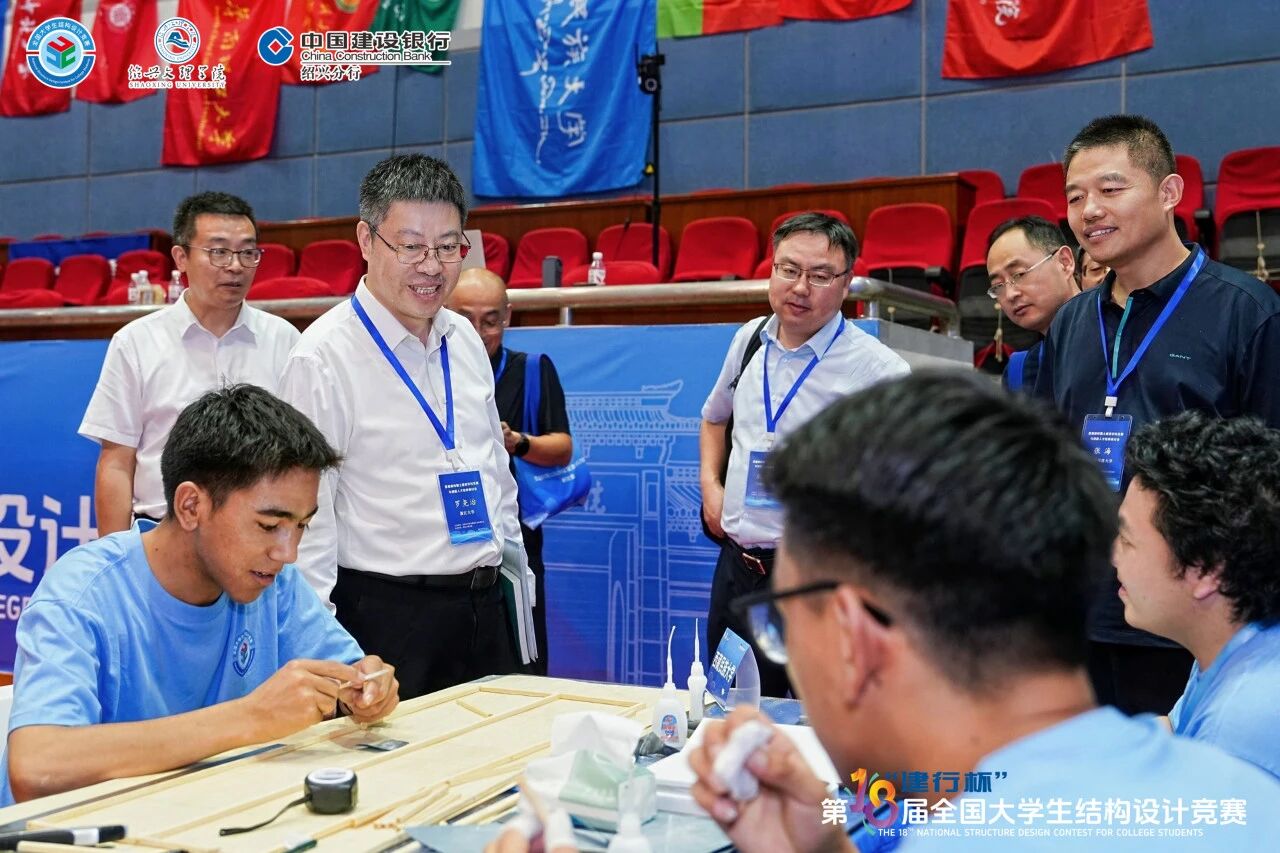 比赛期间,我校土木工程学院院长张海随专家组亲临现场指导。在观摩学生制作过程时,张海对团队在高压环境下展现的专业素养给予高度评价:“模型创新性地解决了传统船体结构静态设计的局限性,这种将力学原理与工程智慧相结合的实践能力,正是我校‘工科’人才培养的生动体现。”