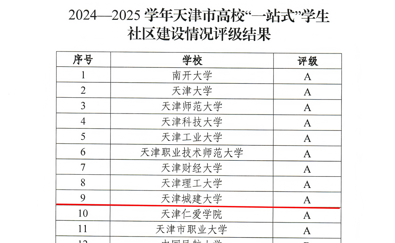 近日,天津市教委公布了2024-2025学年天津市高校“一站式”学生社区建设情况评级结果,我校获评A级建设单位,这已是我校连续三年获得这一荣誉。