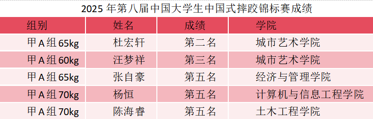 近日,第八届中国大学生中国式摔跤锦标赛在内蒙古乌兰察布市圆满落幕。本次赛事由中国学生体育联合会主办,共有来自河南大学、西北大学、天津体育学院、武汉体育学院等59所高校的近700名运动员、教练员参与角逐。我校选派5名运动员参赛,斩获1枚银牌、1枚铜牌及3个第五名的好成绩。