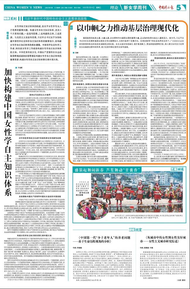 《中国妇女报》分别以《以巾帼之力推动基层治理现代化》《以人民城市理念引领妇女主体性发展》为题,刊发我校马克思主义学院教师闫妍、周淮娇的理论文章,具体如下: